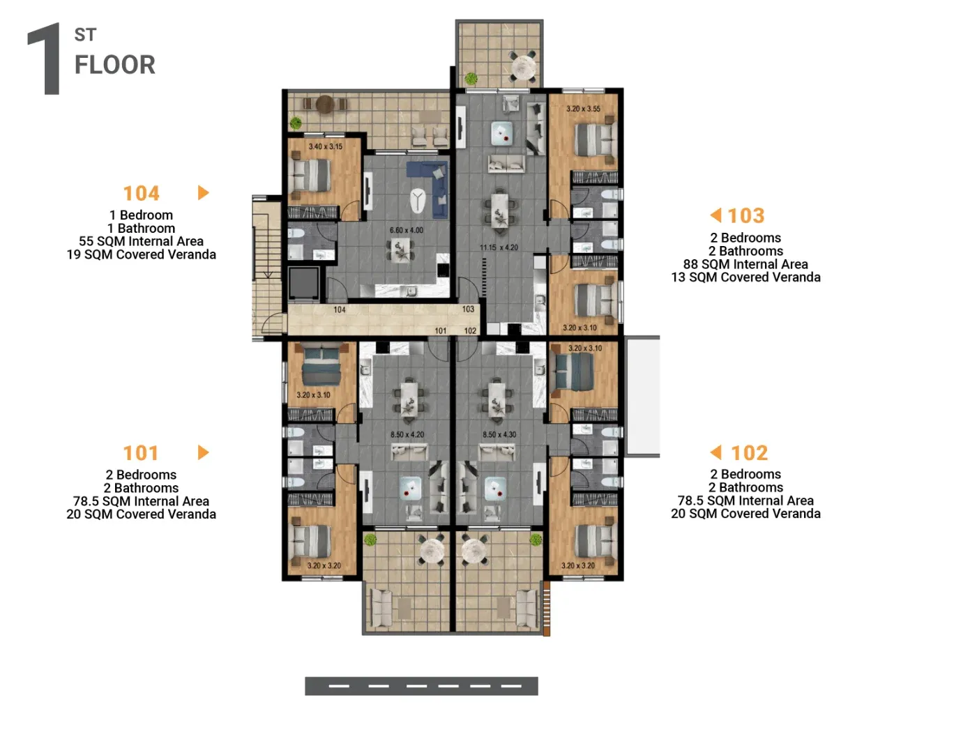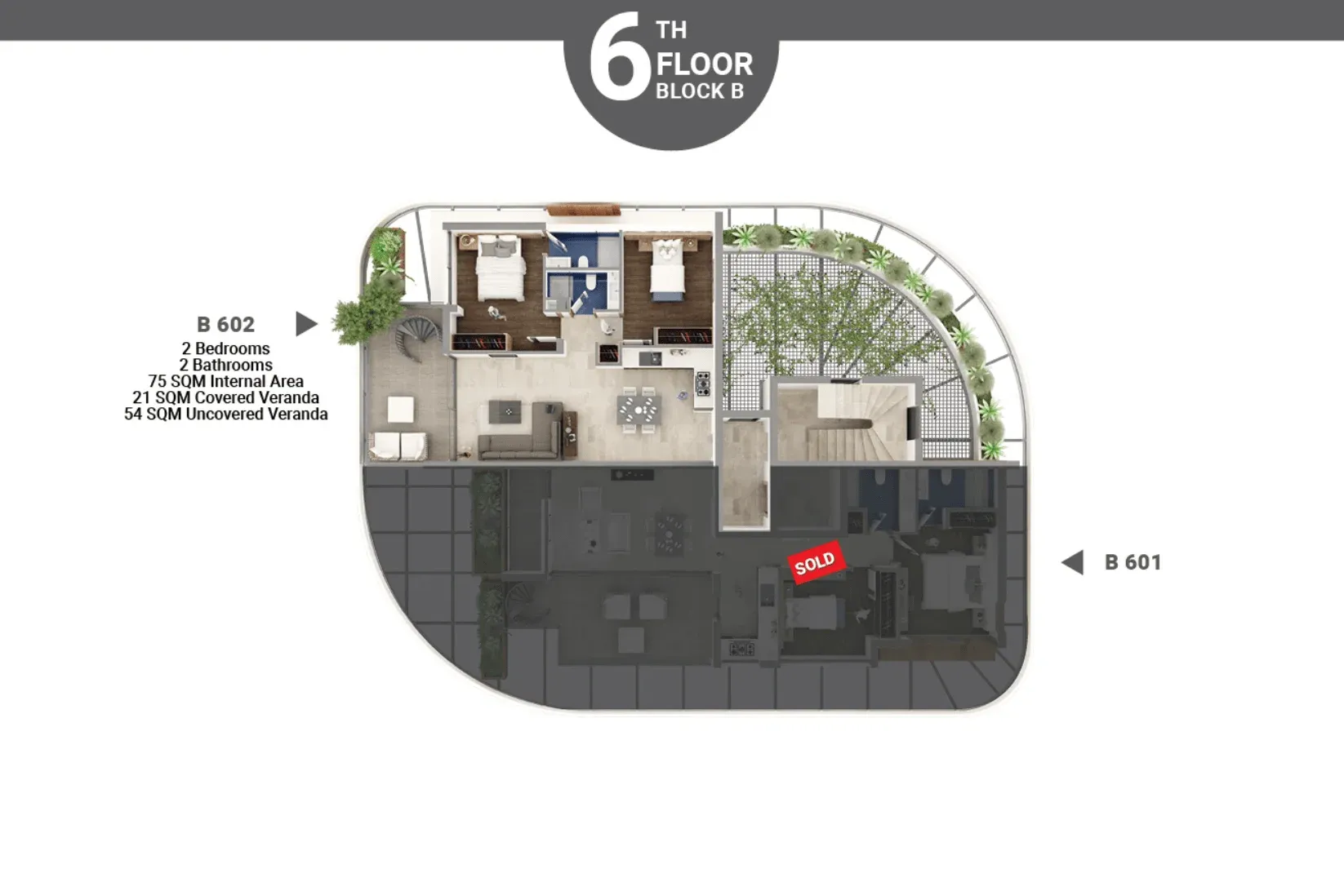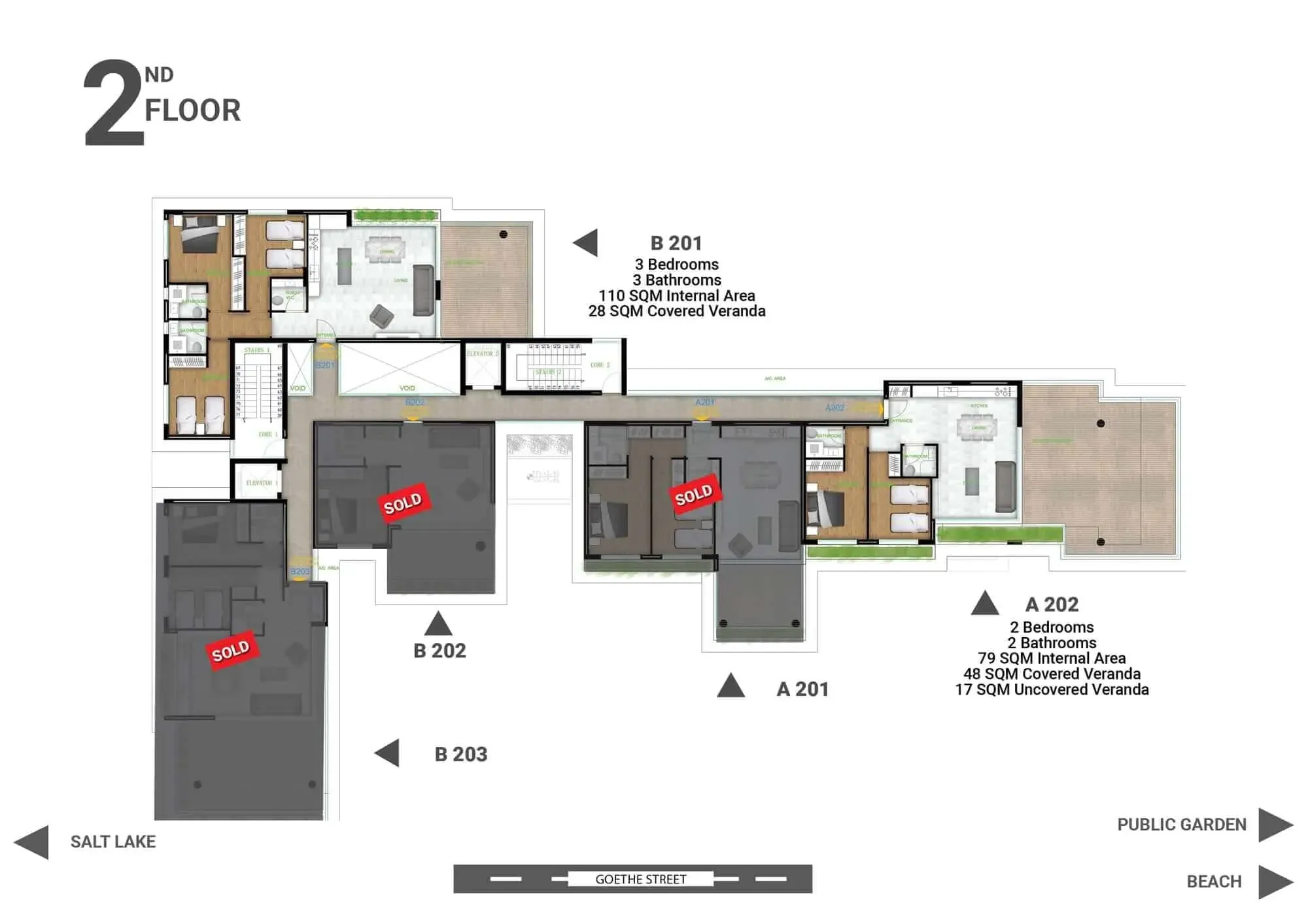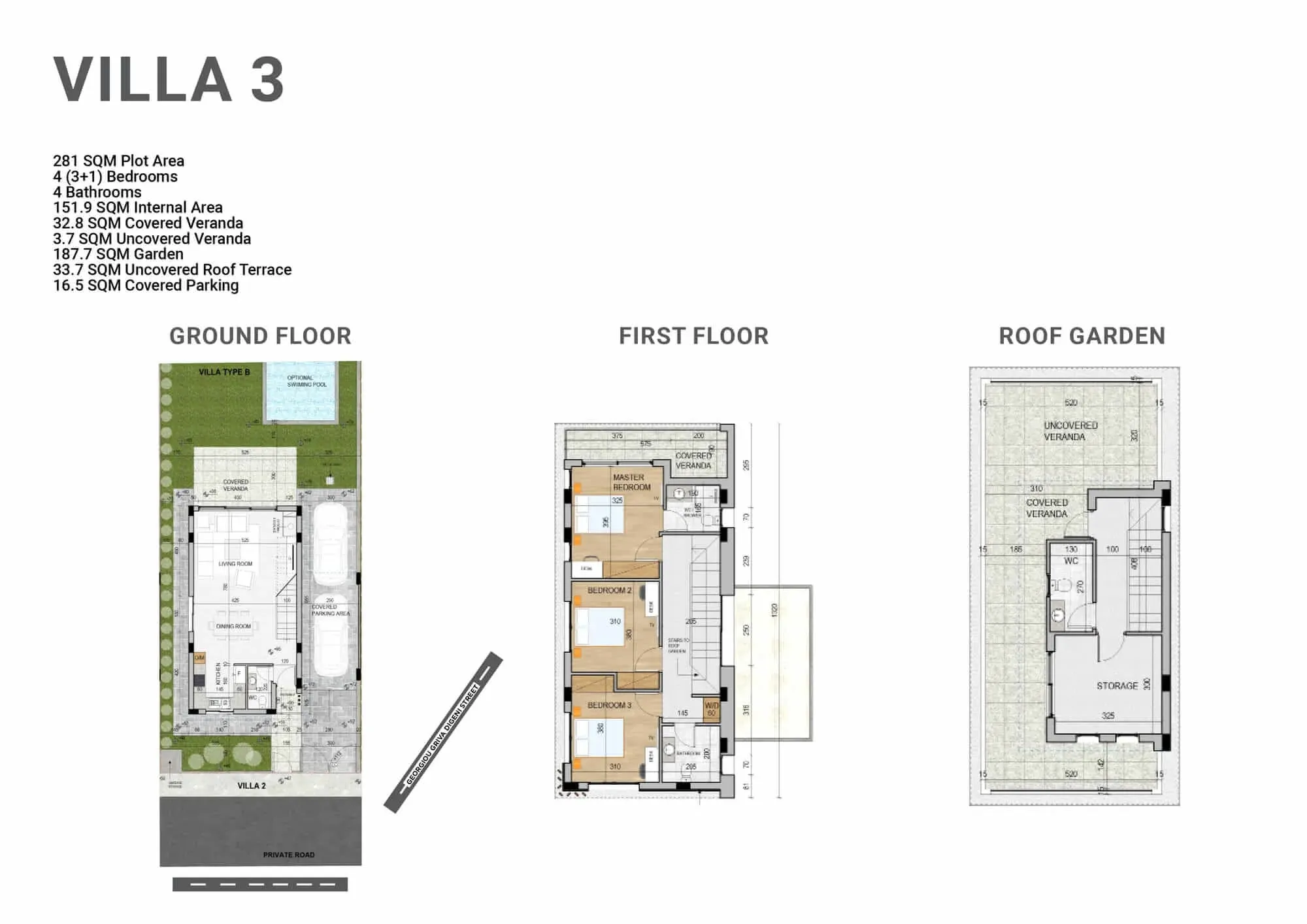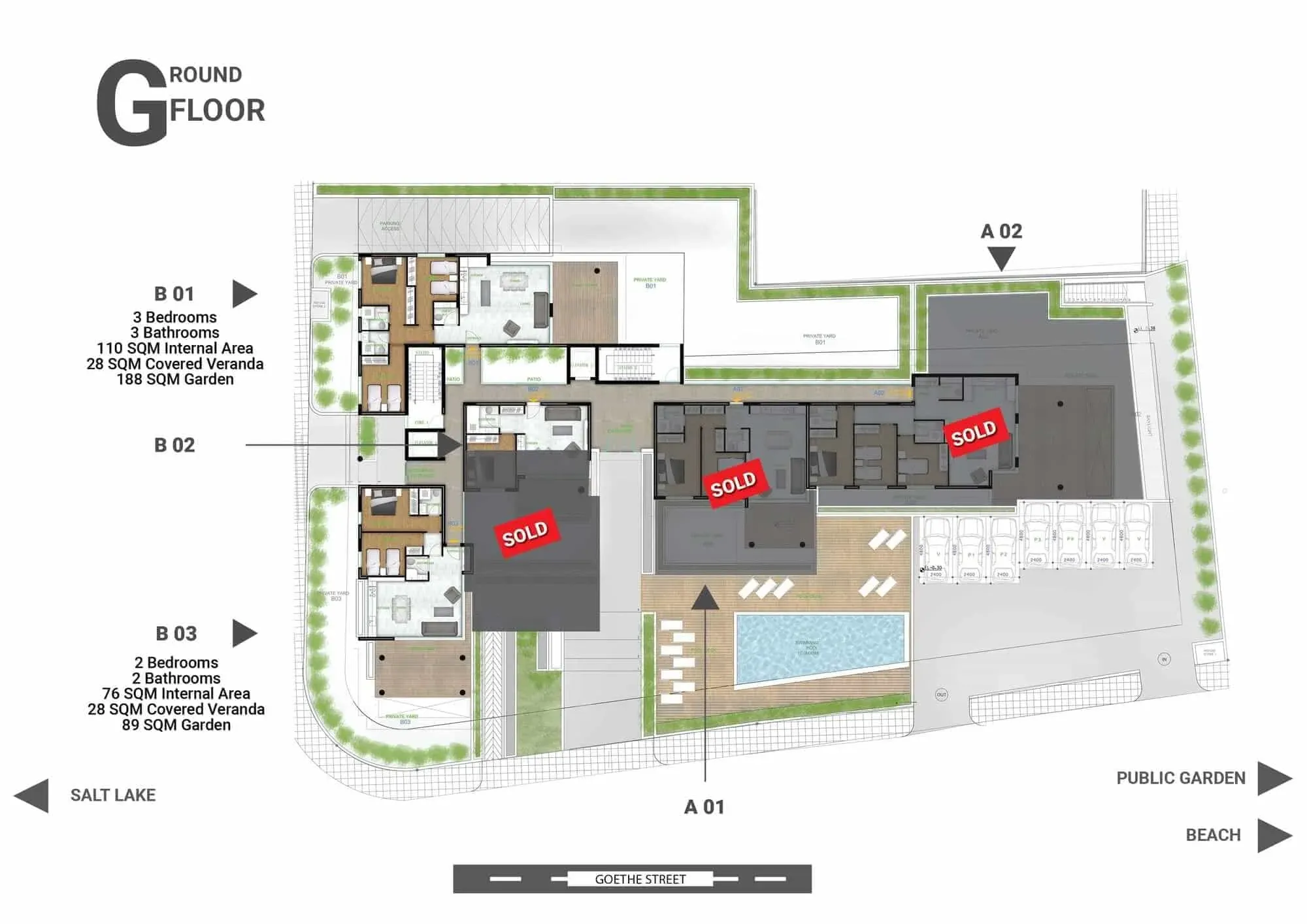 Unit | Floor | Type | Bedrooms | Bathrooms | Parking | Internal Area (m²) | Covered Veranda (m²) | Roof Terrace (m²) | Total Area (m²) | Price | Status | Action |
