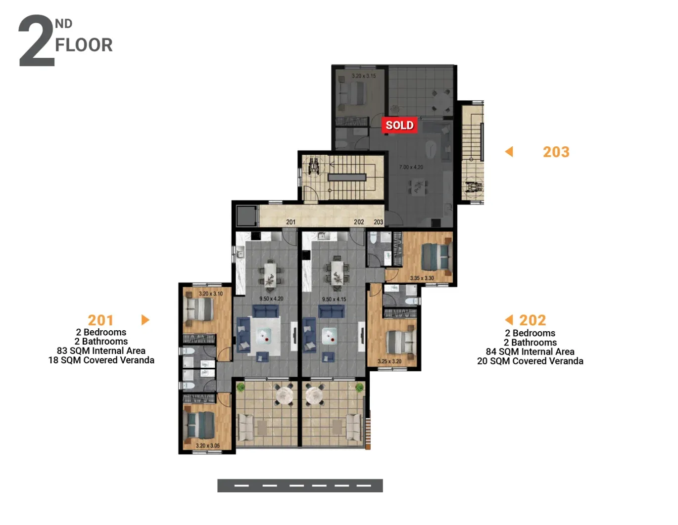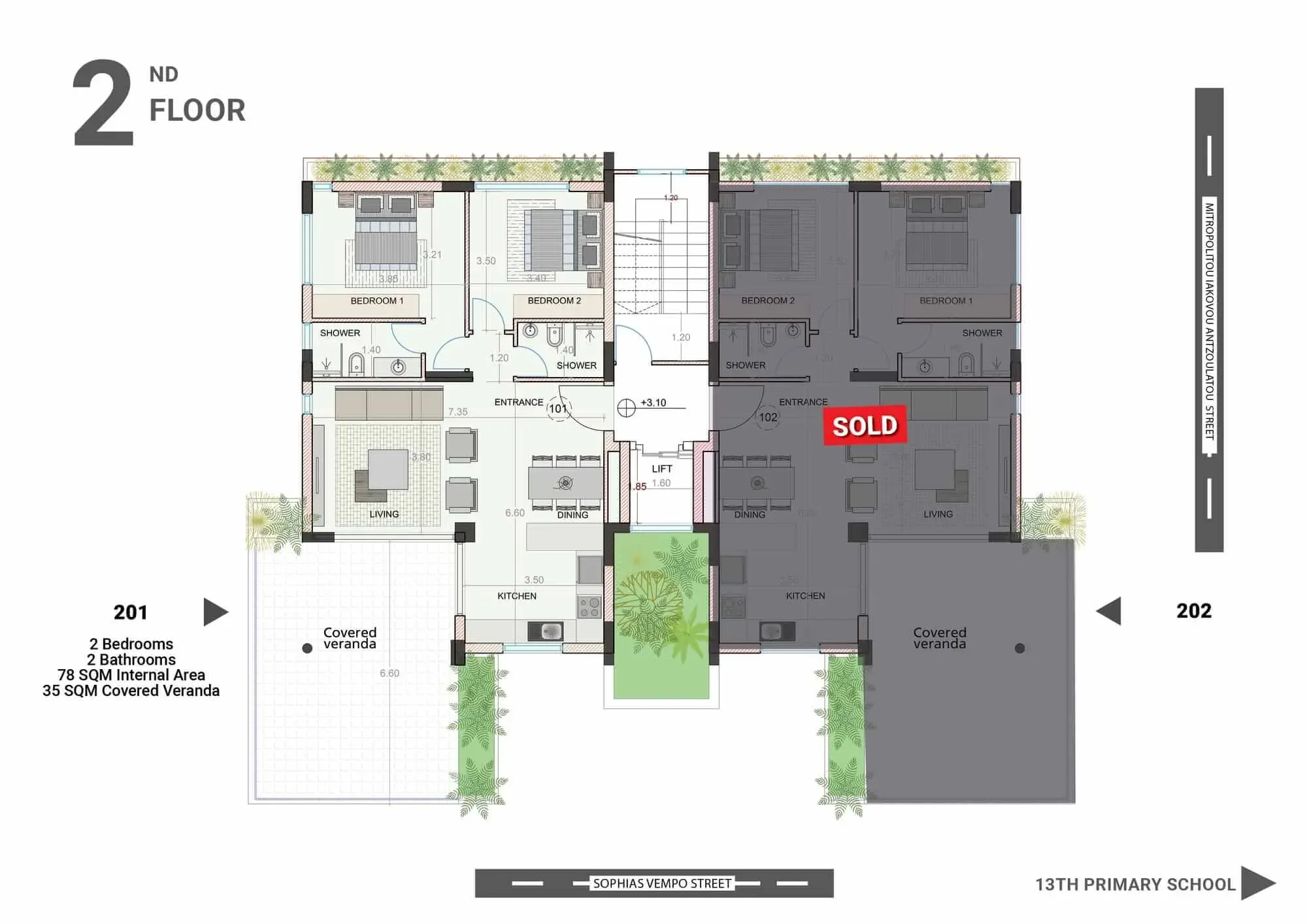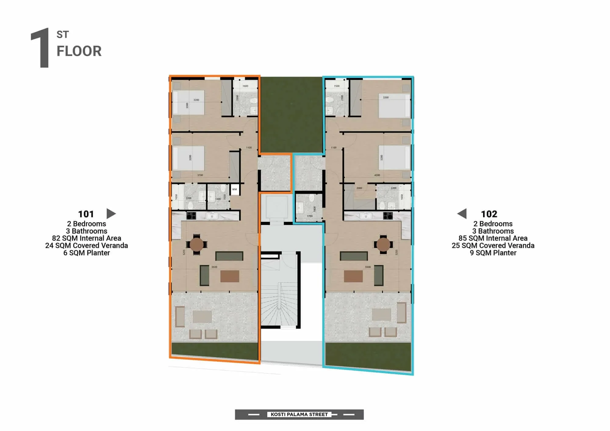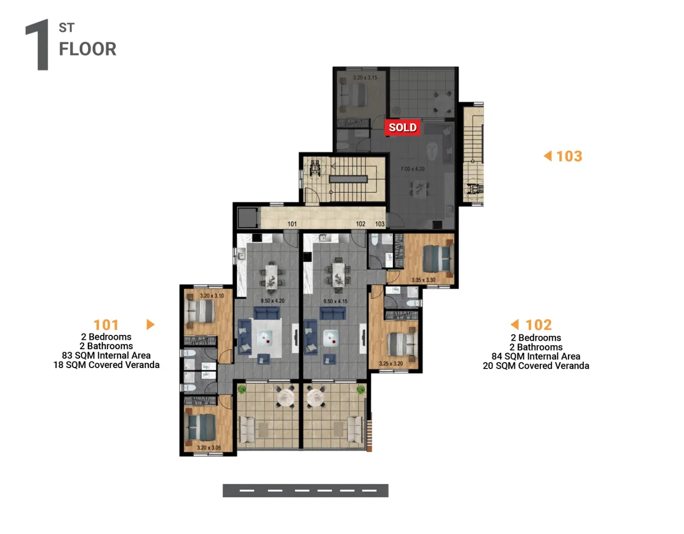 Unit | Floor | Type | Bedrooms | Bathrooms | Parking | Internal Area (m²) | Covered Veranda (m²) | Roof Terrace (m²) | Total Area (m²) | Price | Status | Action |
