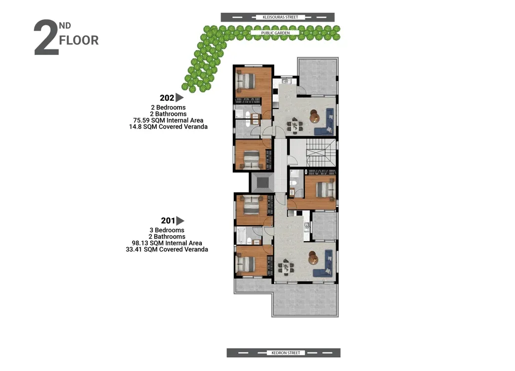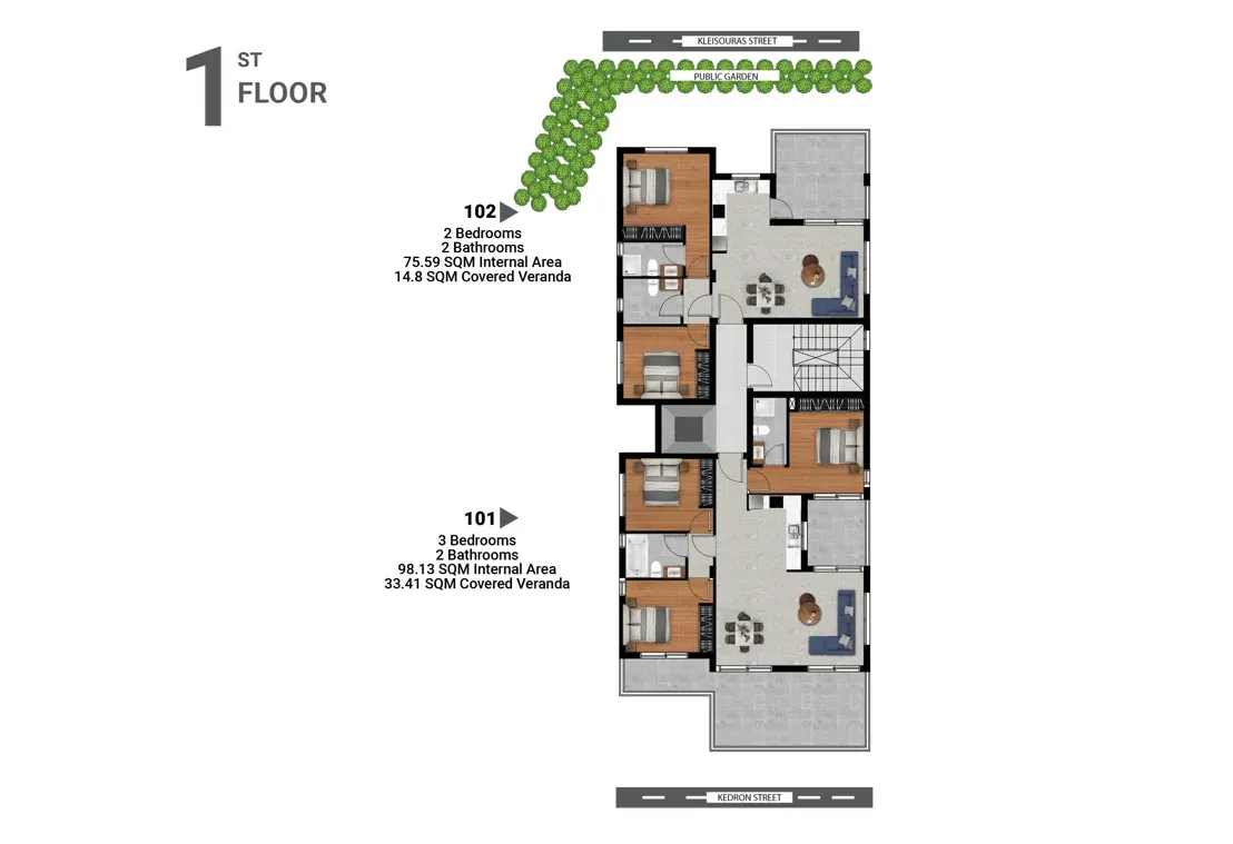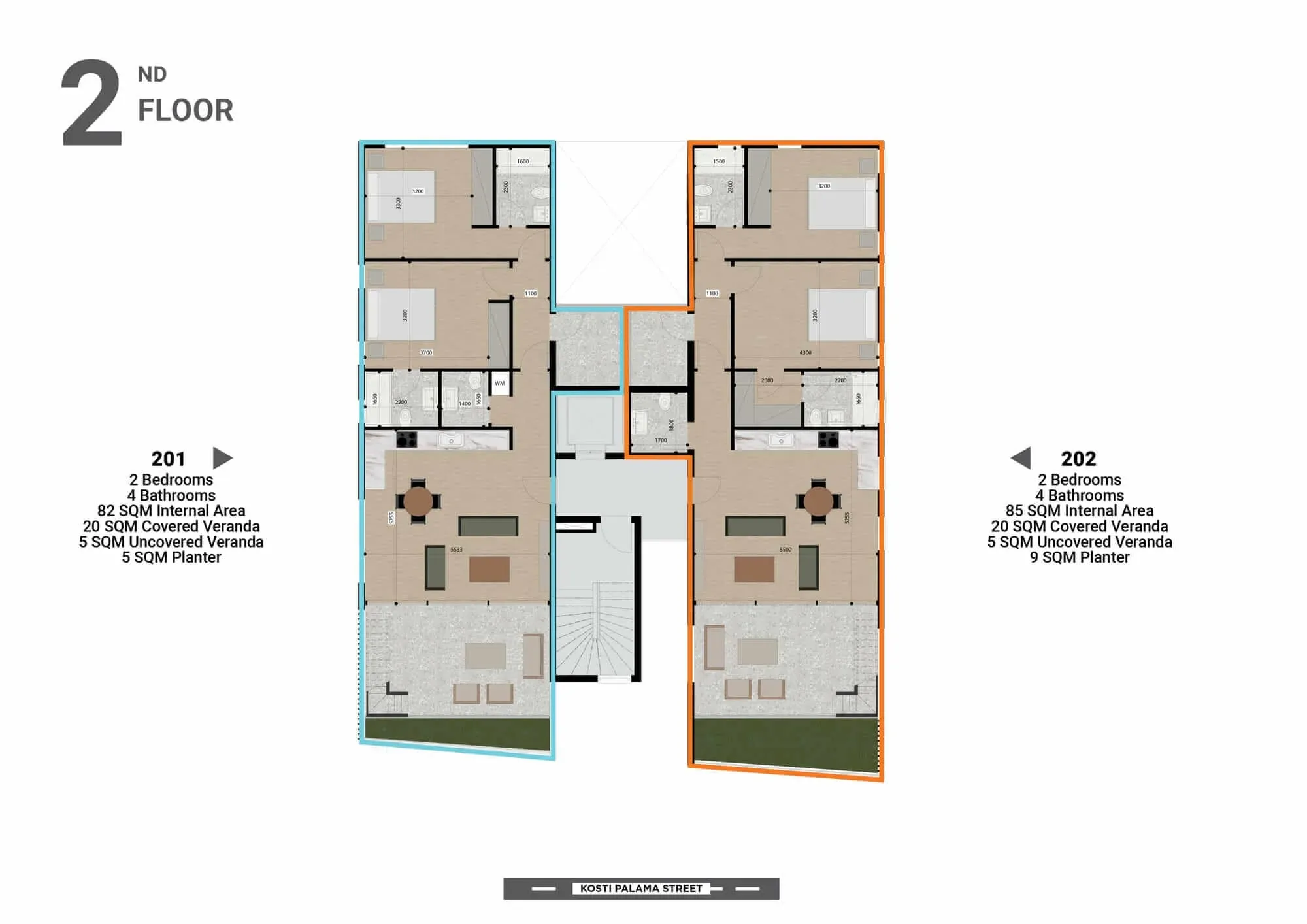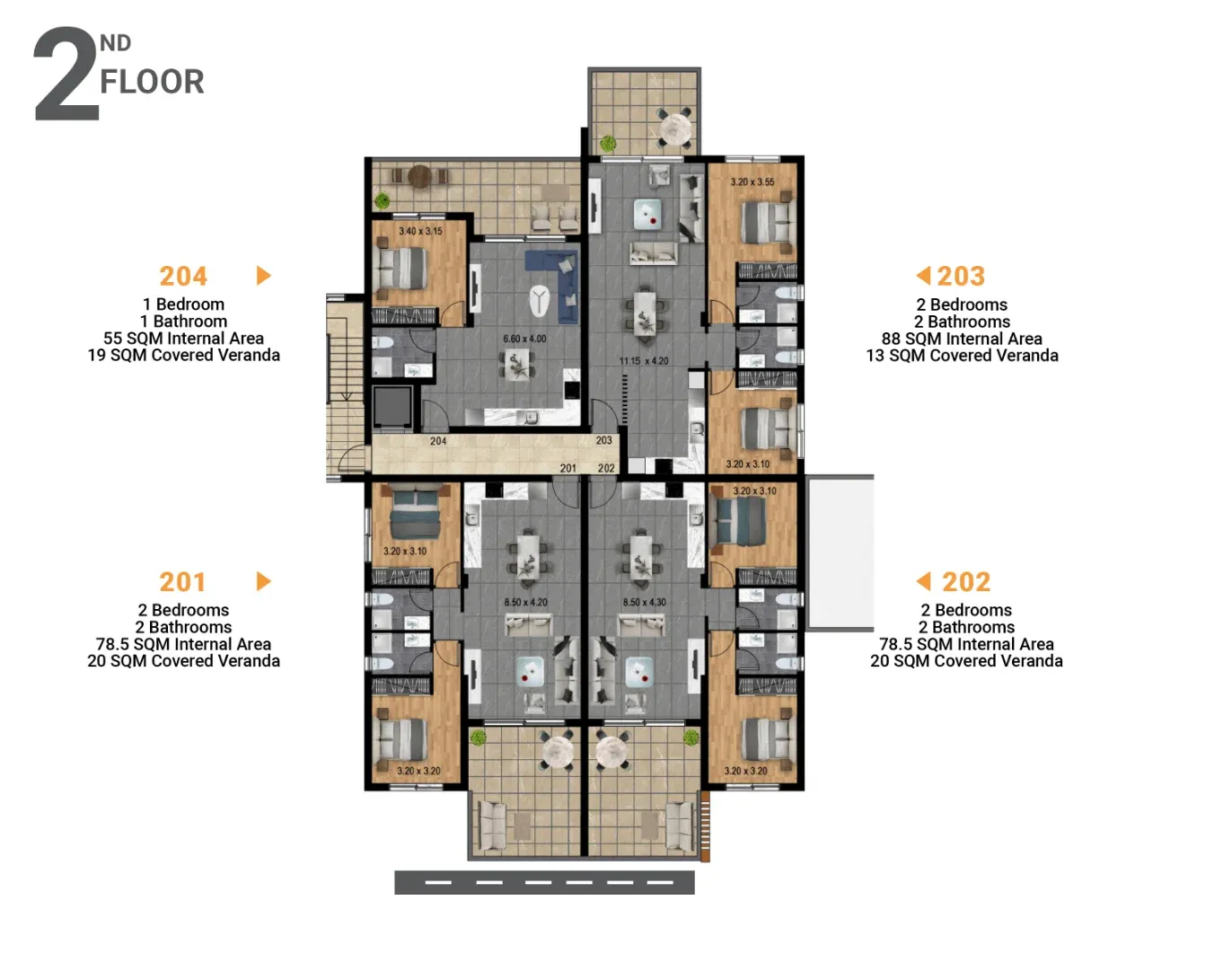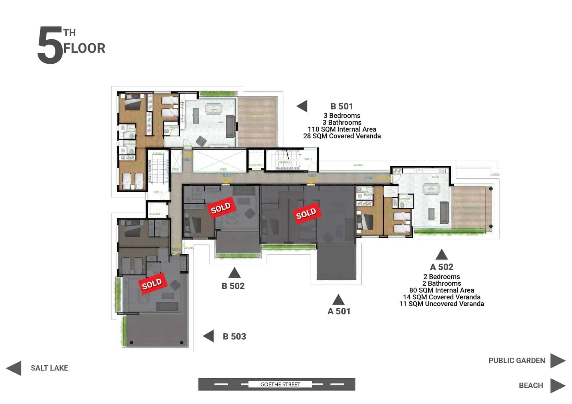 Unit | Floor | Type | Bedrooms | Bathrooms | Parking | Internal Area (m²) | Covered Veranda (m²) | Roof Terrace (m²) | Total Area (m²) | Price | Status | Action |
