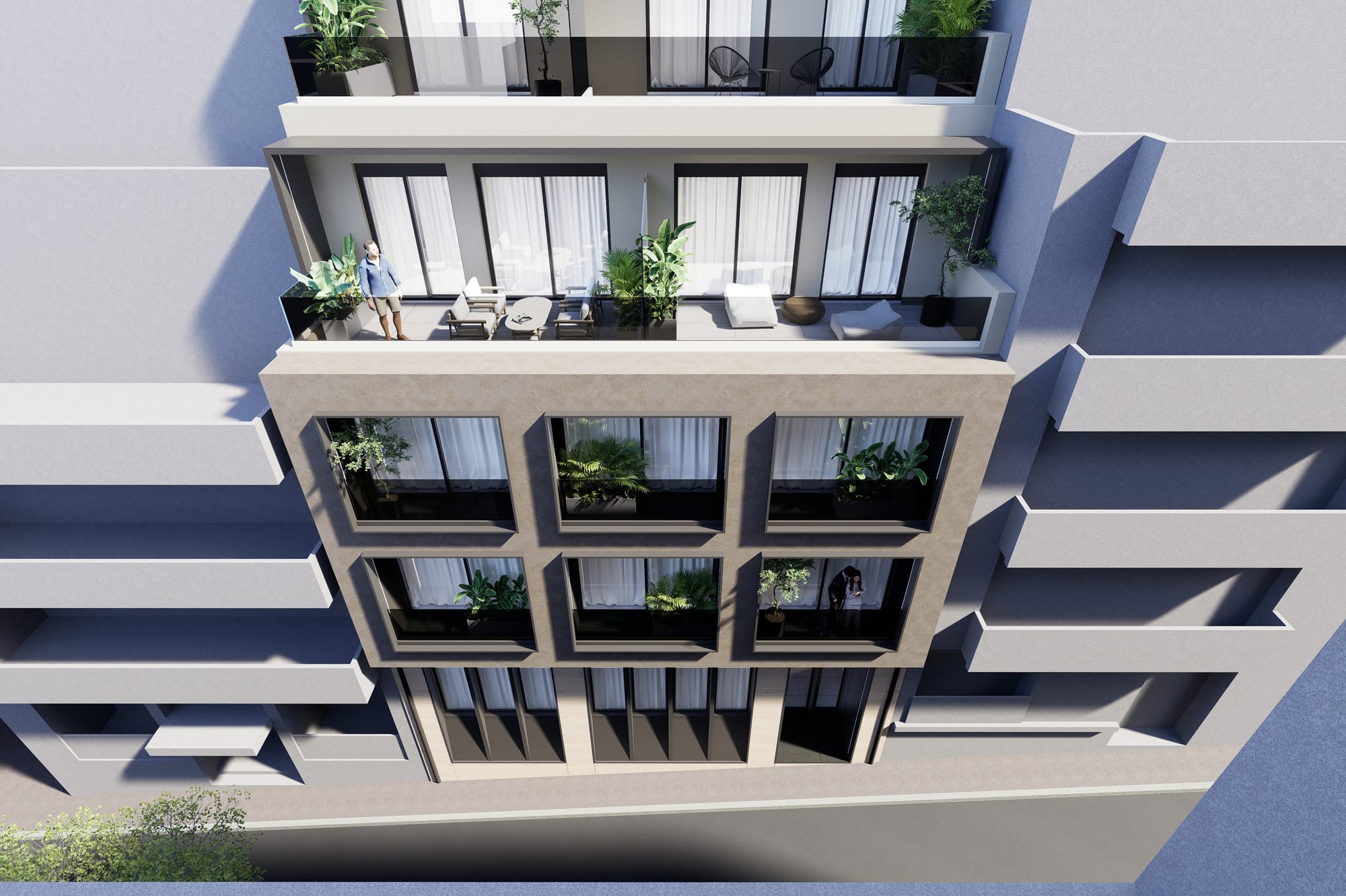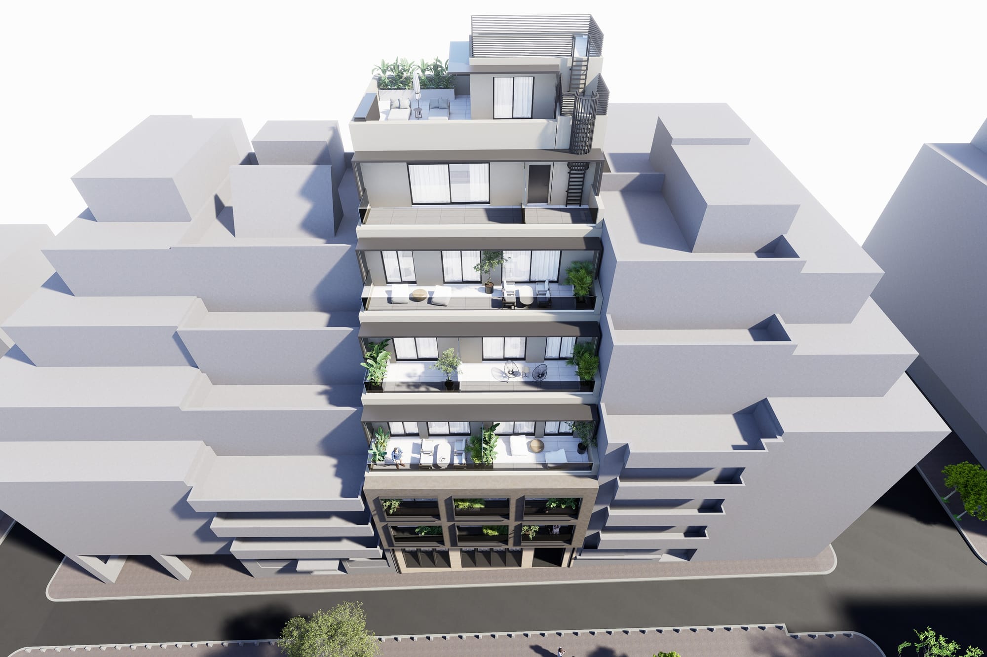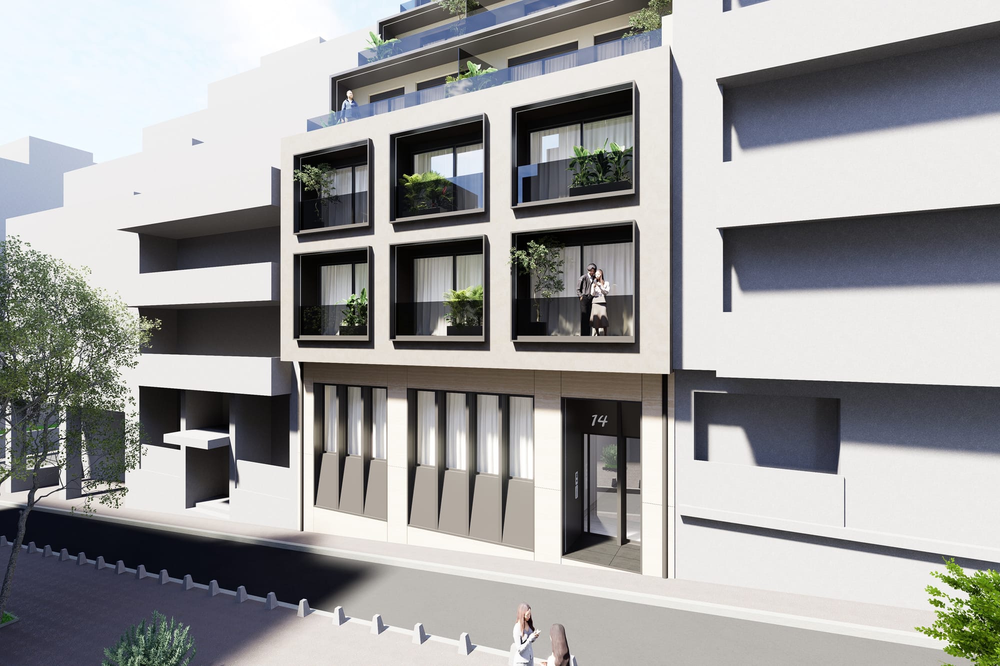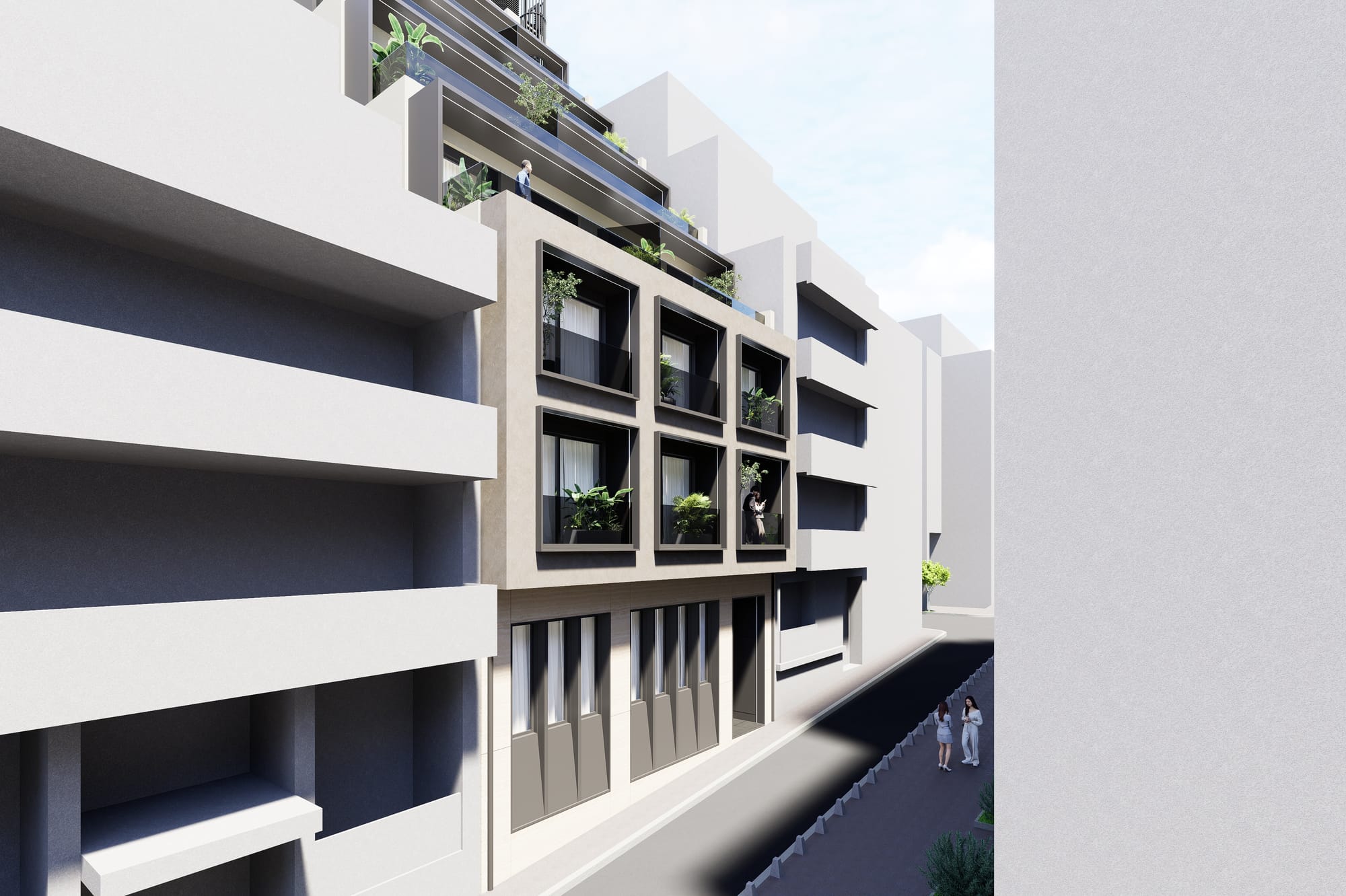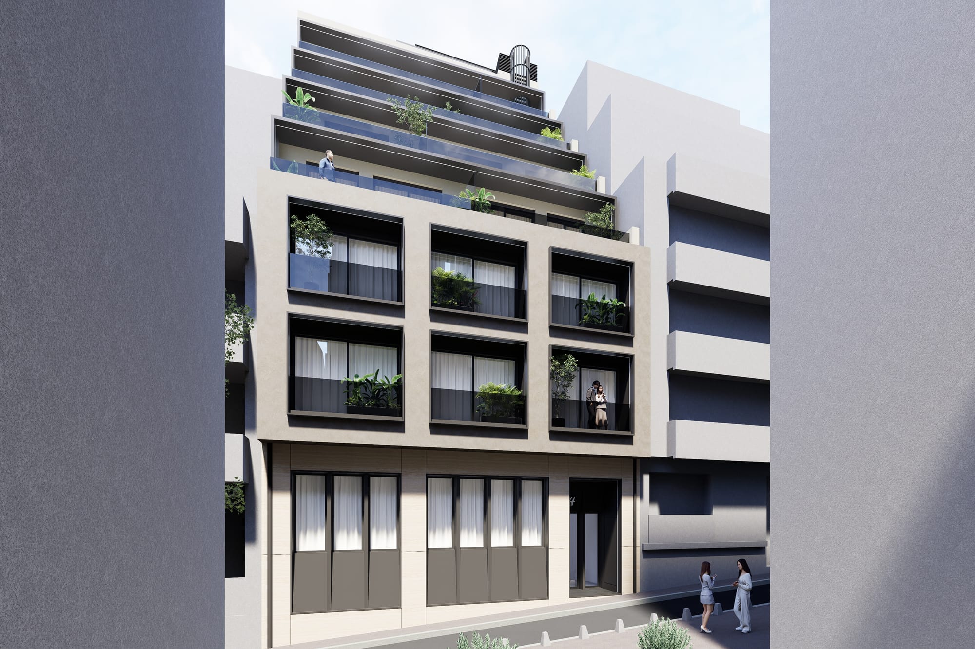 A sophisticated reconversion of a former commercial building, featuring 24 contemporary residences across 7 floors.